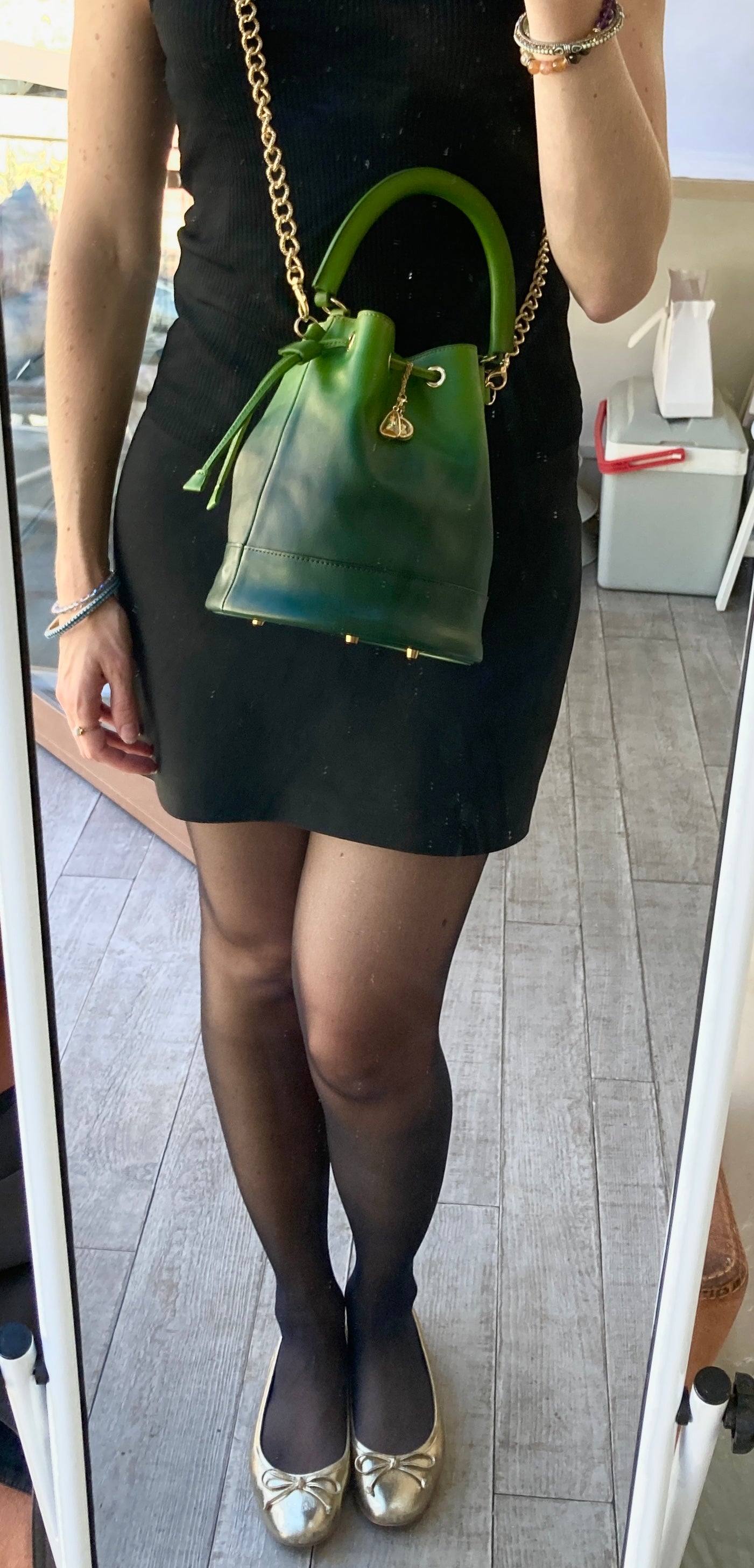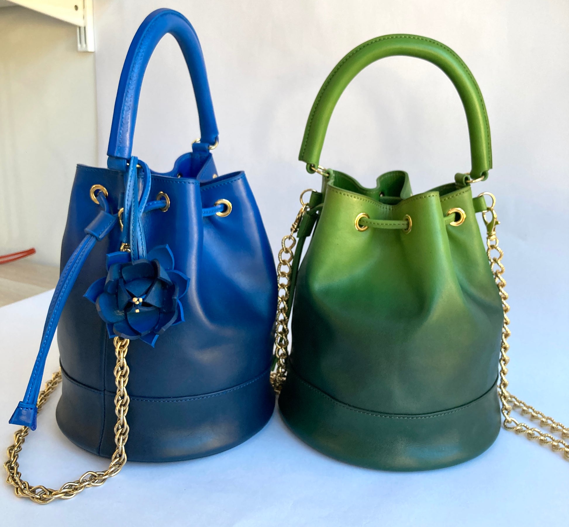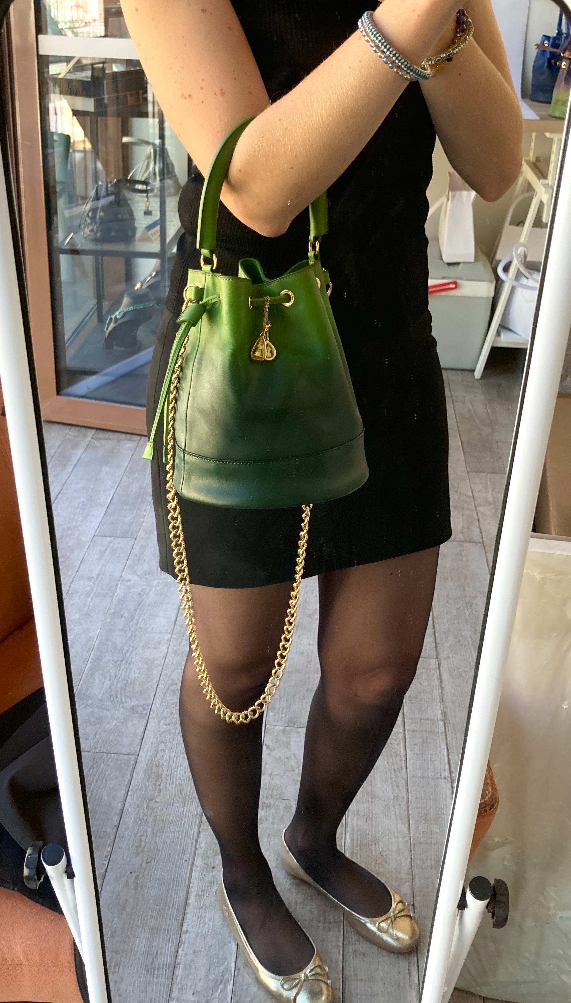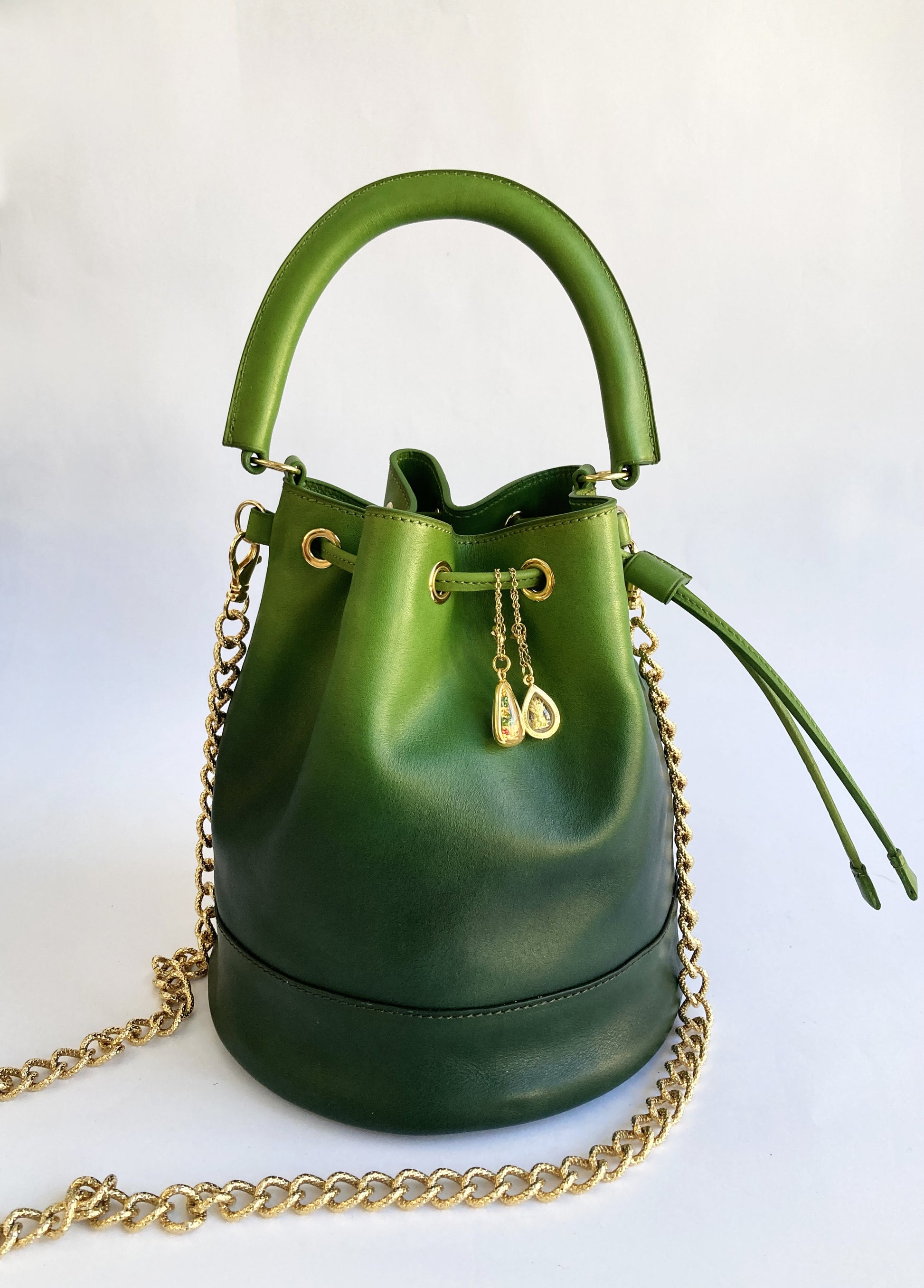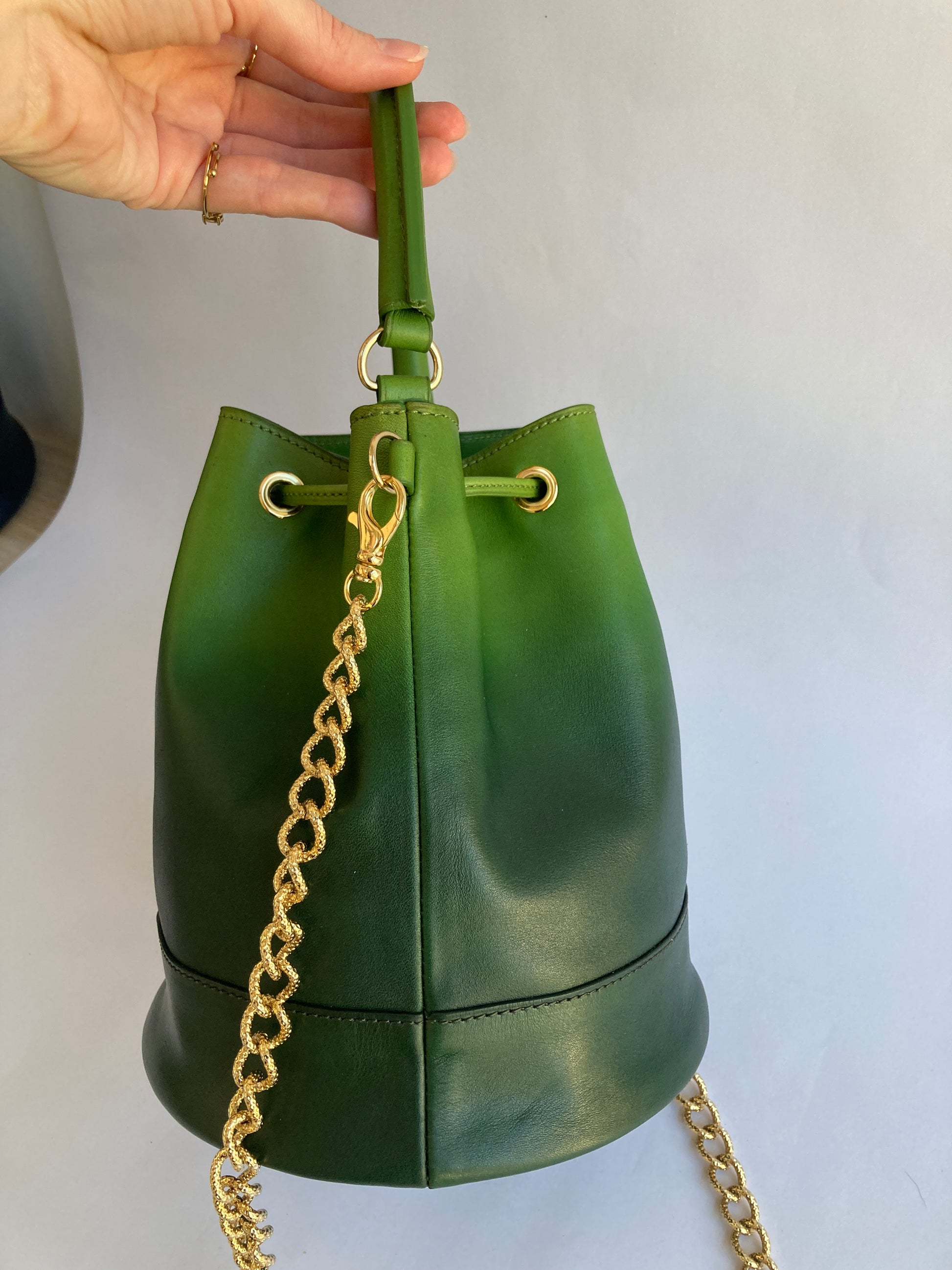 Toute la bijouterie est en laiton doré (oeillets, pieds de sac, mousquetons, chaîne) et la chaîne provient d'Italie.