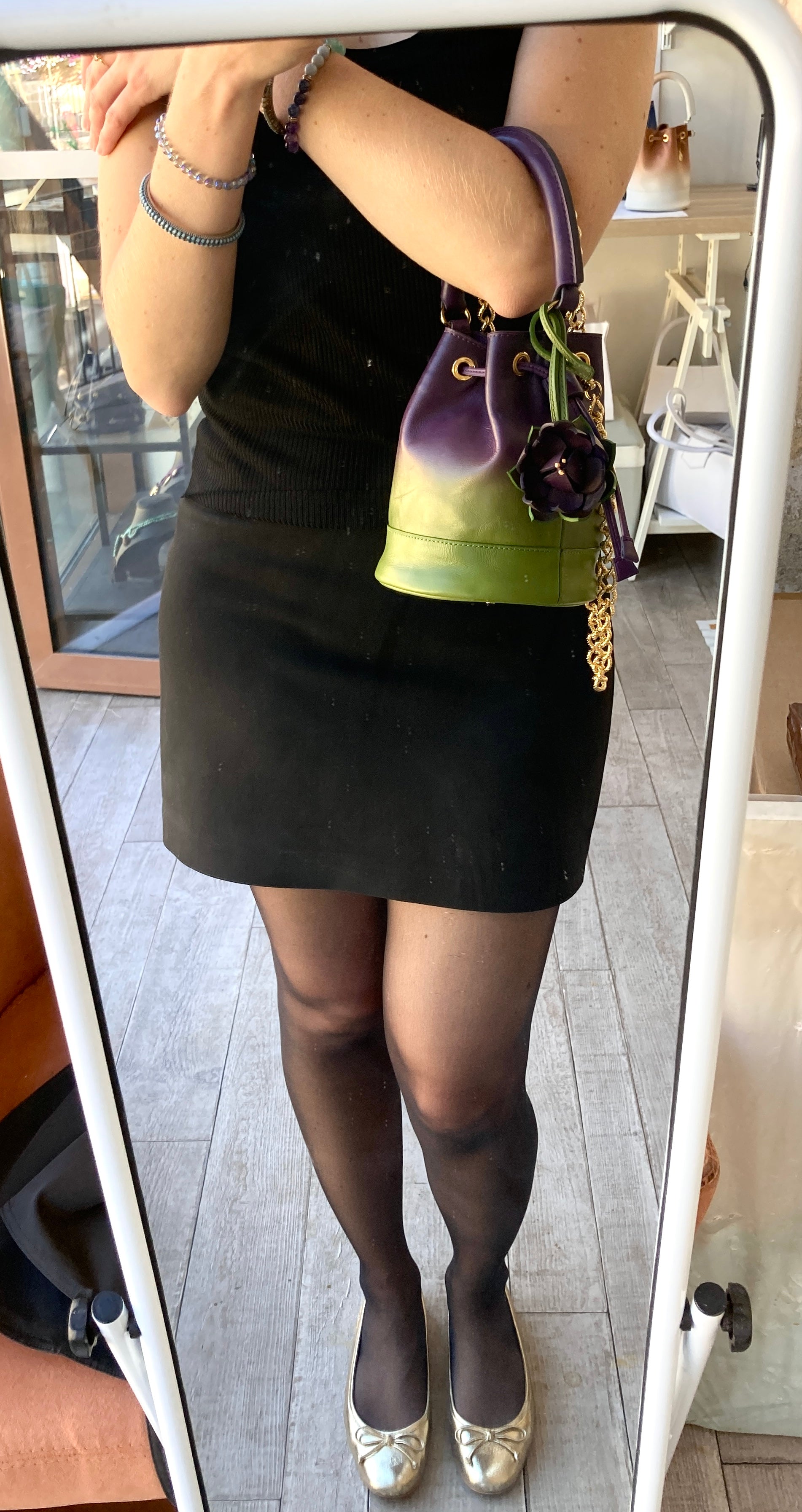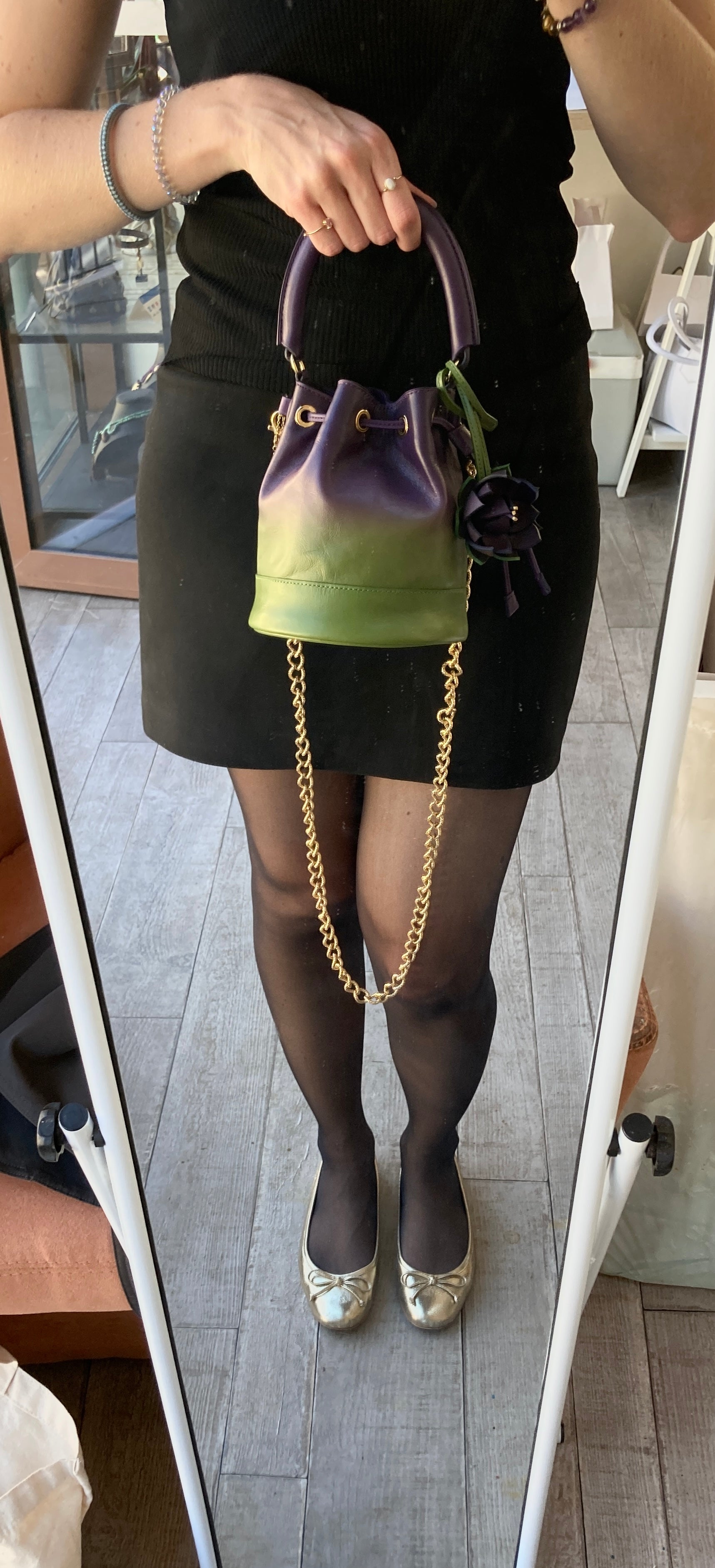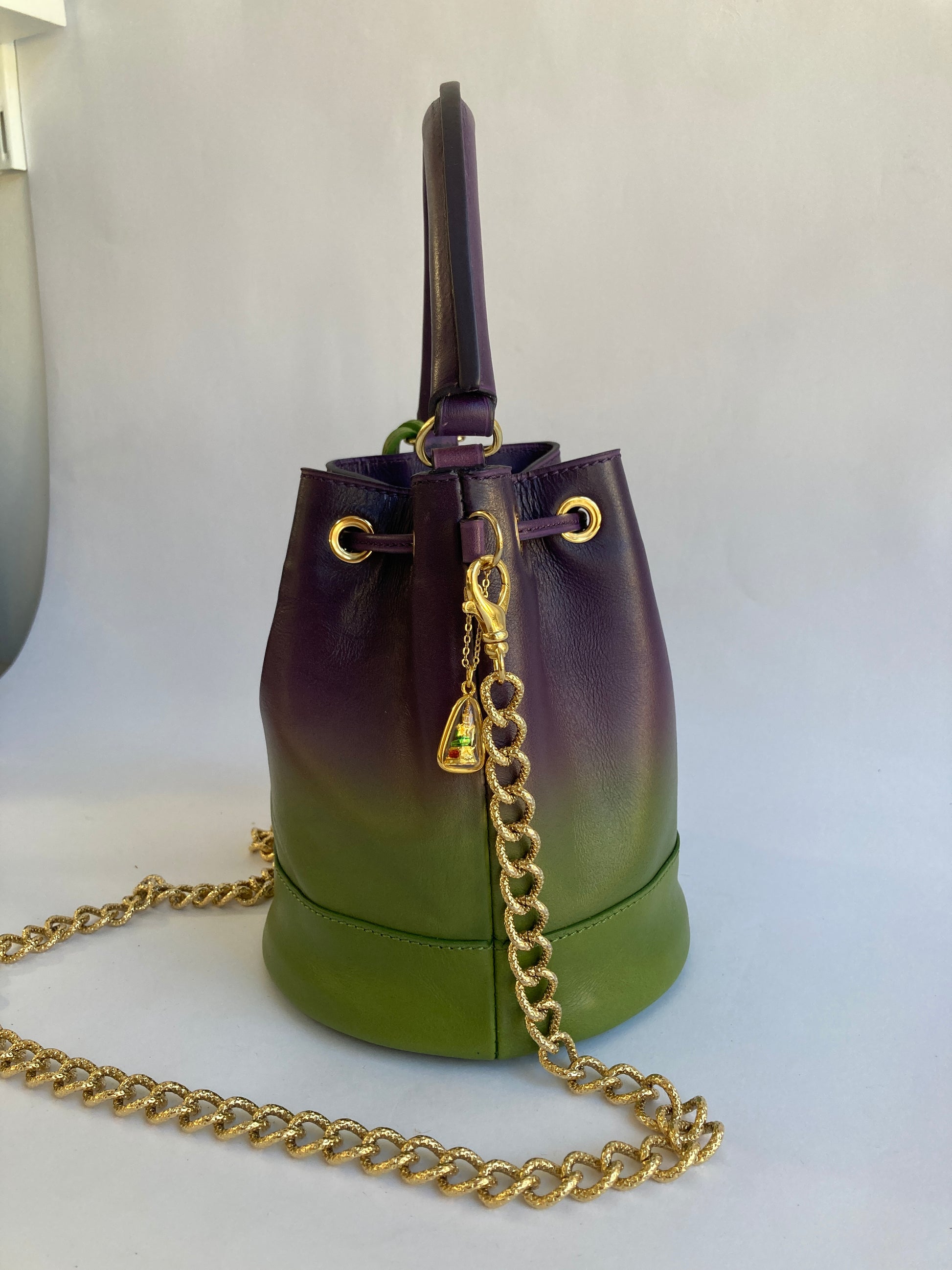 Toute la bijouterie est en laiton doré (oeillets, pieds de sac, mousquetons, chaîne) et la chaîne provient d'Italie.